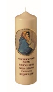 Handverzierte Marienkerze in Kirchenkerzen Qualität. Die Marienkerze wird in traditioneller Handarbeit von unserer Kerzenmanufaktur in Deutschland hergestellt. Bei der Herstellung der Marienkerze werden ausschl. Wachswaren nach RAL Kerzenqualität verwendet.