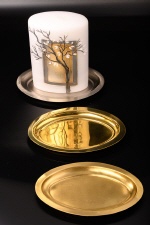 Kerzenteller in ovaler Form aus Messing in den Farben Gold und Silber.
